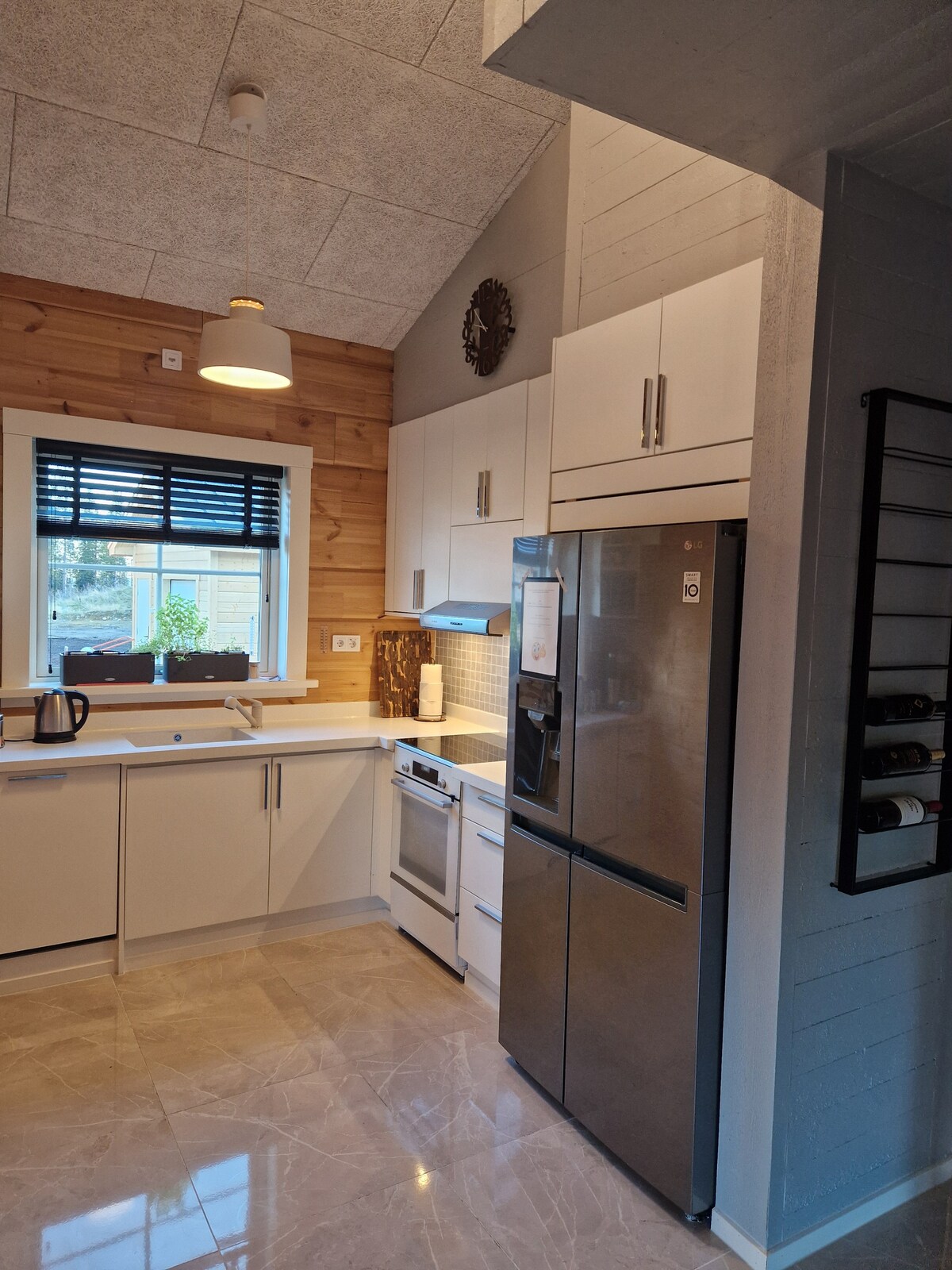 Slappna av i detta lugna boende.Här bor du i ett exklusivt, nybyggt timmerhus invid Torne älv.Boendet är i 2 plan och består av kök, stort badrum,stort allrum, 2 sovrum,SMART TV,skotork,stor uteplats både på neder-och övervåningen,uteplats vid älven.Fantastisk utsikt över Torne älv där du ser en blandning av NORRSKEN, skotrar,hundspann och vinterbadare.Det finns att boka vedeldad bastu och grillkåta, mot avgift.Gångavstånd till Icehotel,hembygdsgården, kyrkan och affär.Parkering utanför dörren.