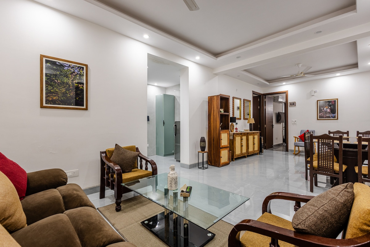 Kick back and relax in this calm, stylish space designed for modern living - The smart Apartment is one of the most peaceful places in New Delhi . Situated centrally in Greater Kailash 1 ( south delhi ) the locality is great for those who are visiting Delhi for a break or plan to work for home - we are an orgized couple who love hosting. The space has its own entrance and kitchen with a large smart tv and work desk - the internet speeds are above 50 mbps witha a Ro and garden in the common areas