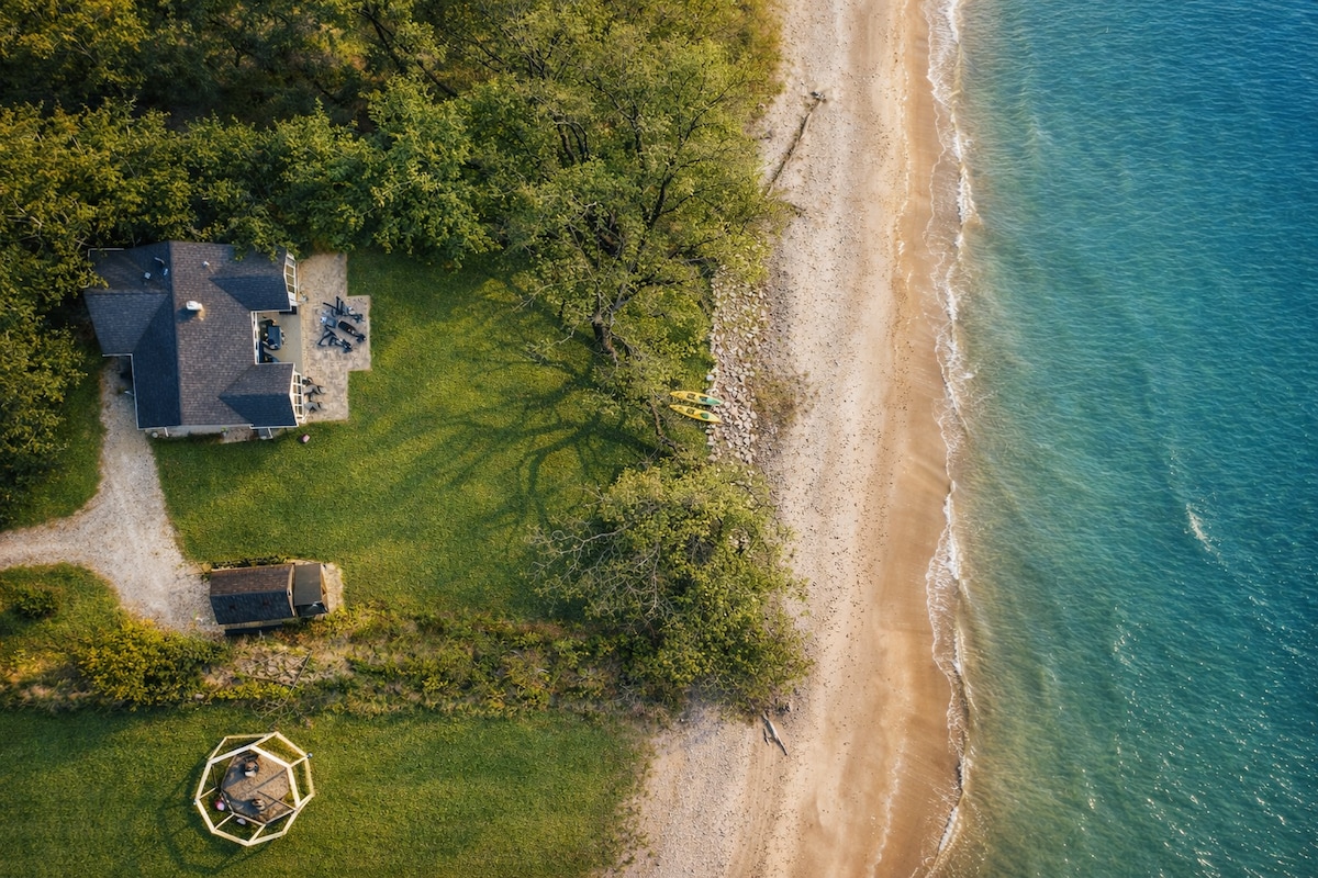 Start and end each day with a beautiful view of the sunrise and sunset. Reconnect with nature at this unforgettable escape featuring a vast lawn overlooking Lake Michigan. This dome home, designed with Feug Shui principles, is the perfect place to find peace and positive energy. Curving stairs connect the floors, creating an inviting flow amid views. The home includes a balcony and a spacious deck for relaxation. The kitchen, dining, and living rooms all overlook the gorgeous lakefront scenery.