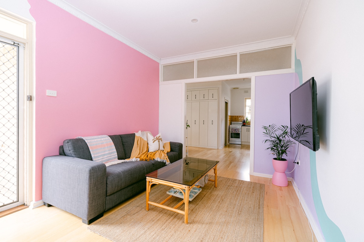 A one-of-a-kind, colourful space full of personality. Check in anytime, easily, 24 hours a day with a lock box and private entry. You're just 500m from Jetty Road with cafes, boutiques and restaurants all the way down to Moseley Square and Glenelg Jetty. Packed with fun touches and everything you need for a comfortable, stress-free stay. •NEARBY• 🚃 Tram - 400m 🛒 Woolworths - 400m 🏖️ Beach - 1.1km ✈️ Adelaide Airport - 8km (15 min drive) 🍷Mclaren Vale - 33km (30 min drive)