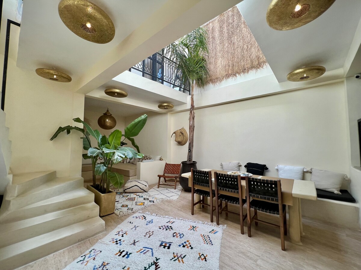 It is a small riad in the heart of the Medina of Marrakech, completely rebuilt in place of a pre-existing ruin. It consists of an entrance, living room with fireplace, dining area, kitchen and bathroom on the ground floor, all rooms are arranged around the patio. On the first floor, there is a double bedroom, a large bathroom, and a hallway with the possibility of a third bed. On the third level, there is a terrace equipped with seating and a breakfast table.