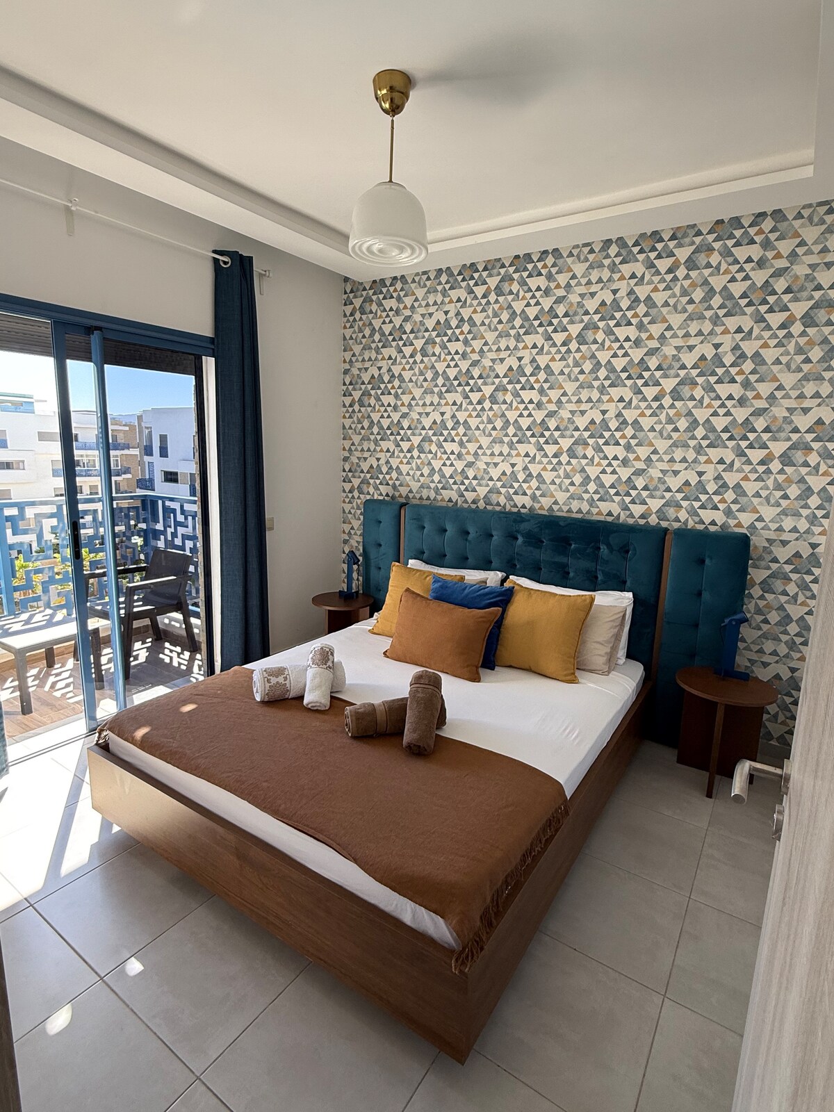 Come and stay in this charming 120 mÂČ artist's apartment with a 30 mÂČ terrace ideal for a meal under a bright ray of sunshine. Located in a quiet and secure residence, this apartment offers a pleasant setting for unforgettable moments with families. With 3 large swimming pools, children's pools as well as secure play areas, this apartment offers comfort to enjoy a mild and sunny stay in one of the most beautiful seaside resorts in Morocco.