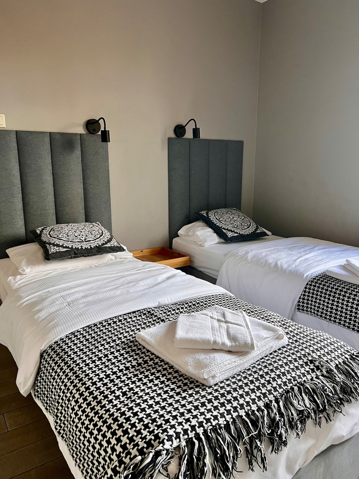 A 15m2 double room, located on the ground floor. The room has two single beds that can be joined into one double bed. A bathroom with a shower, a set of towels replaced upon request, a hair dryer, a fridge, a kettle, and a tea/tea set. The windows have mosquito nets and blackout blinds.