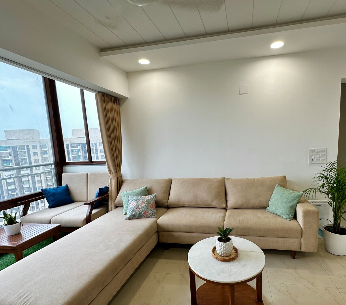 A modern, serene, and immaculately kept 2BHK apartment in the secure and peaceful Shantigram society. Designed with a clean, light, and airy aesthetic, this entire apartment offers superior comfort and convenience for families or groups (up to 4 guests). Your Pristine Stay Includes: * Two Queen Bedrooms * Enjoy perfect temperatures with 3 AC units living area and bedrooms * Fully Equipped Kitchen * Modern Utilities: Washing Machine and Instant Geysers in both bathrooms for hot water * WiFi