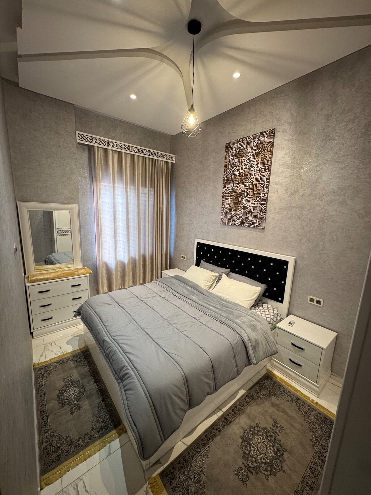 Modern and bright apartment, perfect for a family stay. It has 2 bedrooms: one with a double bed and one with 2 single beds, an equipped kitchen and a spacious living room. Located in a quiet area, it offers all the comforts you need. In accordance with Moroccan law, only married couples are accepted. You'll also get air conditioning, wifi, and a clean, well-maintained space for a pleasant stay.