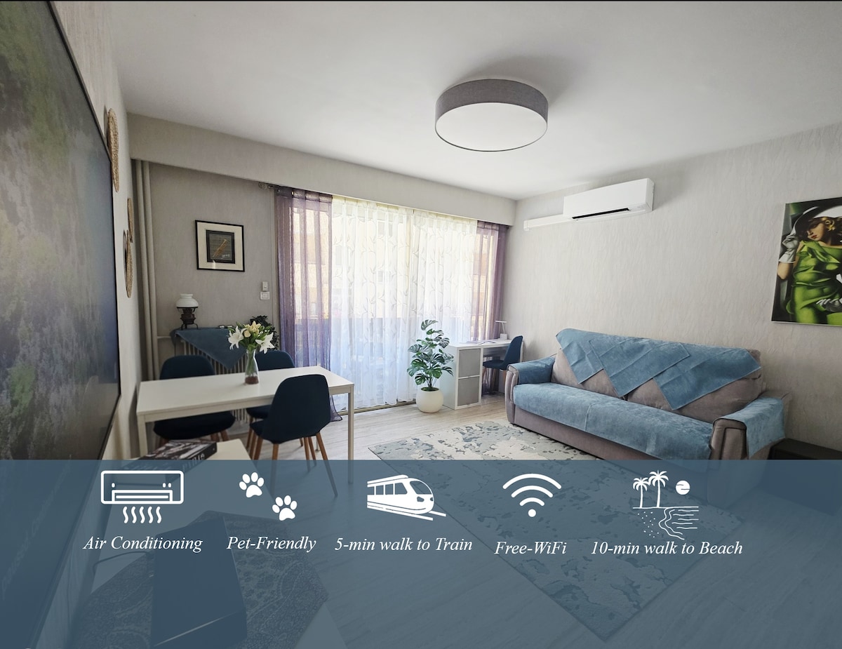 Nice 2 rooms with balcony, located in the city center. The apartment is fully renovated, located on the 3rd floor with elevator, 100 meters from the beach and 15 minutes' walk from the train station. Paid public parking nearby. Close to all amenities, pedestrian area, shops and restaurants nearby. Fiber optic: Wi-Fi + TV decoder. Reversible air conditioning. Accommodation suitable for a family with young children. Our four-legged friends are welcome.