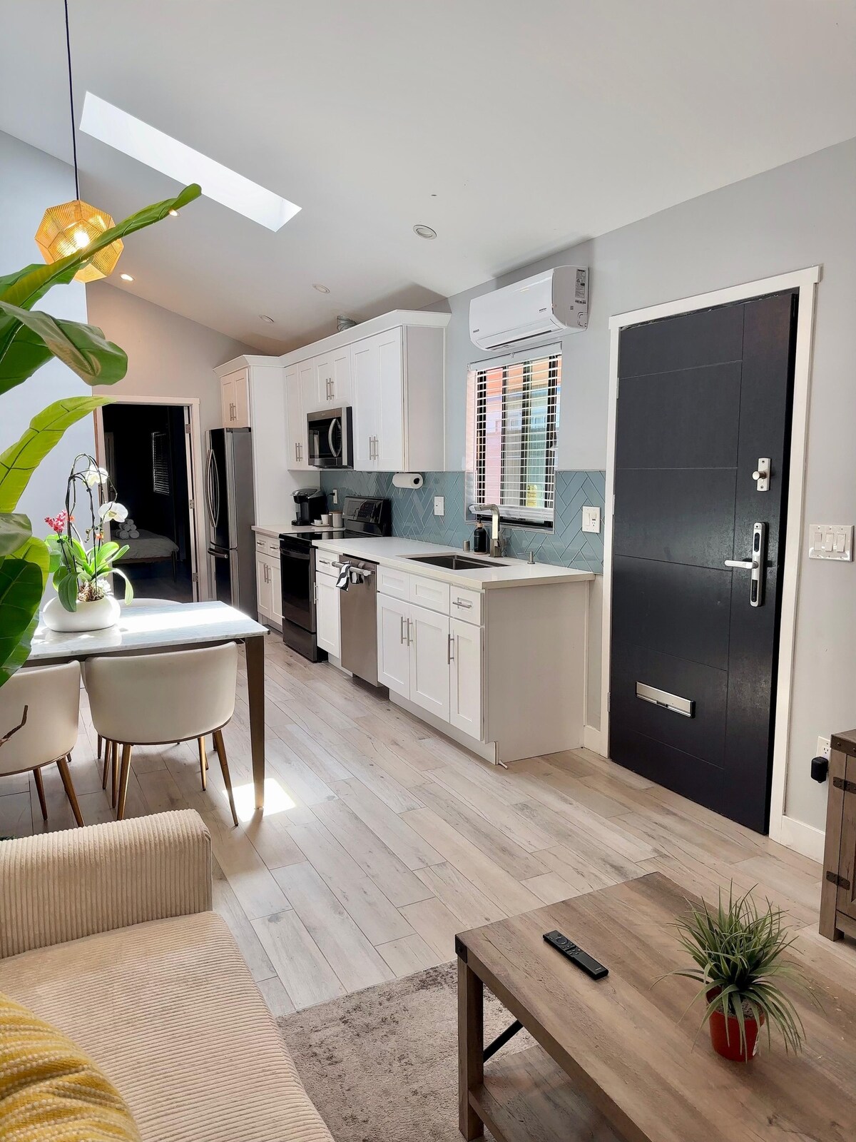 This is a newly built guesthouse that is attached to the main house. House entrance is private and separated from the main house. It has separate bedroom, kitchen, dining and living room. High vaulted ceiling throughout the house. The skylight brings in bright natural light to the living space. Beautiful 10 feet marble bathroom and floating vanity. House has two individual control mini-split A/C units, washer&dryer.