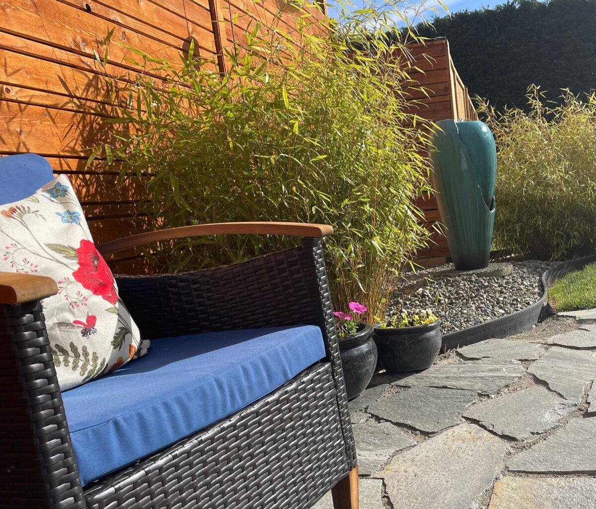 Step Inn Stones is a delightful, private entry suite located in the quaint Historical Village of Cowichan Bay, BC. Located on a no-through road above the village with a beautiful ocean view for a tranquil getaway, we are a five-minute walk to fine dining, shops, pubs, marinas and more. Our newly renovated suite has a small kitchenette, bar counter with a view, new comfy queen sized bed, seating for relaxing, reading and TV watching and a bathroom with heated floors and a rain head shower.