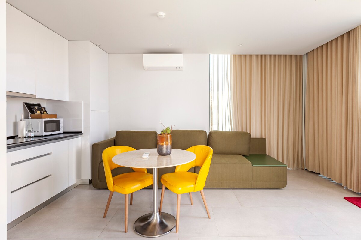 The accommodation is made up of 4 modules, with a total of 9 units (6 T0 and 3 T1). The Twin Lodge is a T0, ideal for 1 or 2 people, offering two single beds and a full bathroom. It also features a balcony with a lovely view of the garden, perfect for reading. Guests can access a shared social area with a multiuse room with a table, a bathroom, and an outdoor deck with a pool view. Pets (dog) allowed exceptionally, with request and extra fee.