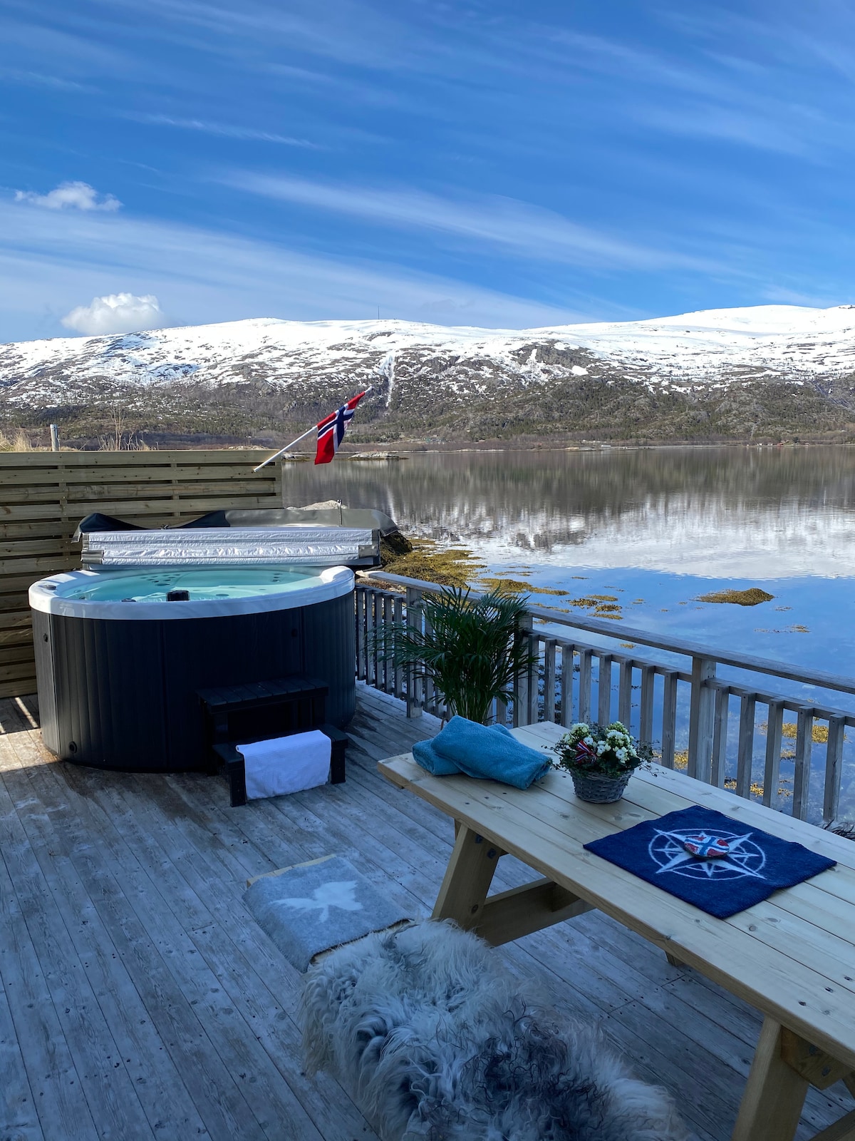 Large cozy cabin of 85 m2, with idyllic location in Naurstad. Jacuzzi/hot tub can be rented, must be arranged in advance. Included in the rent of the jacuzzi you will be provided with a bathrobe. The cabin has a lovely sea view and nice hiking trails in the area. The cabin has a good standard, waterborne floor heating, central vacuum cleaner and all amenities available. Entrance to quiet days by the sea and nature and can experience, among other things, moose and sea eagles up close. Perfect cabin for those who want to fish, enjoy nature and cabin fun.