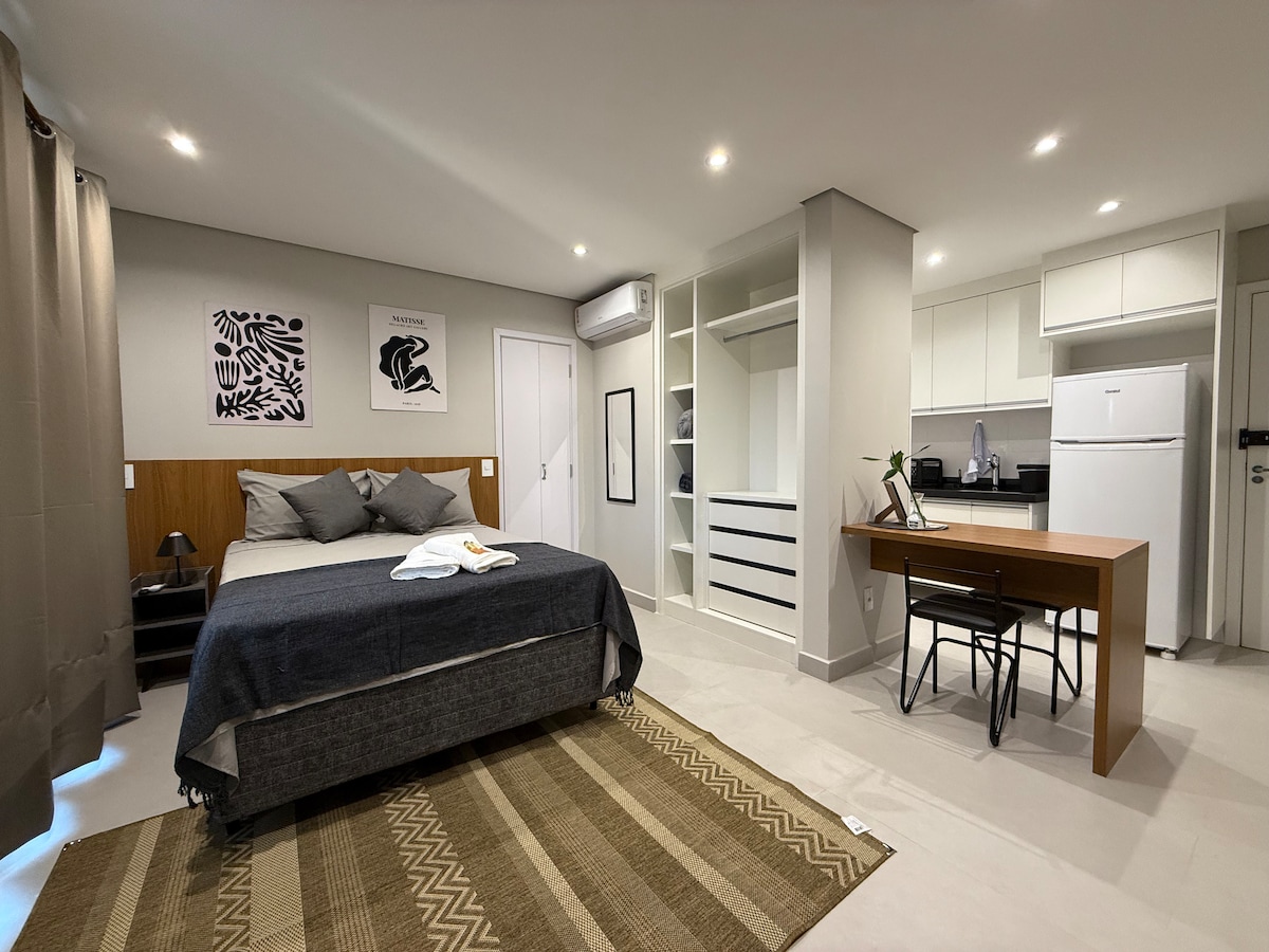 Studio acolhedor e completo com Wifi e vaga grátis