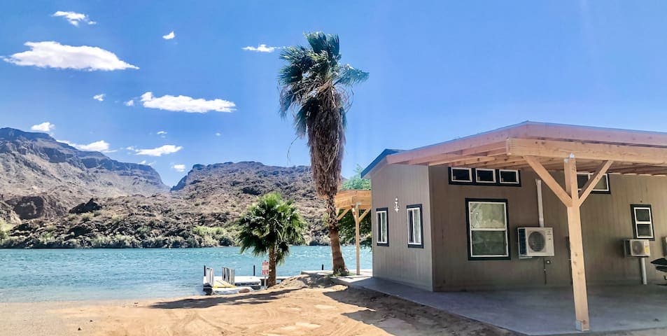 Waterfront tiny house with big views! Located directly on the Parker Strip. With a master, loft, bathroom, living room, and kitchen this house will meet all your needs! Enjoy your stay while kicking back on the patio, on the water, or chilling inside under the air conditioners. This house comes fully equipped for a great fun-filled getaway. 3 queen beds, 2 v's and one of the comfy sectionals. Please note Parker Dam is closed from 11pm-5am, no trailers allowed. Must cross in the town of Parker