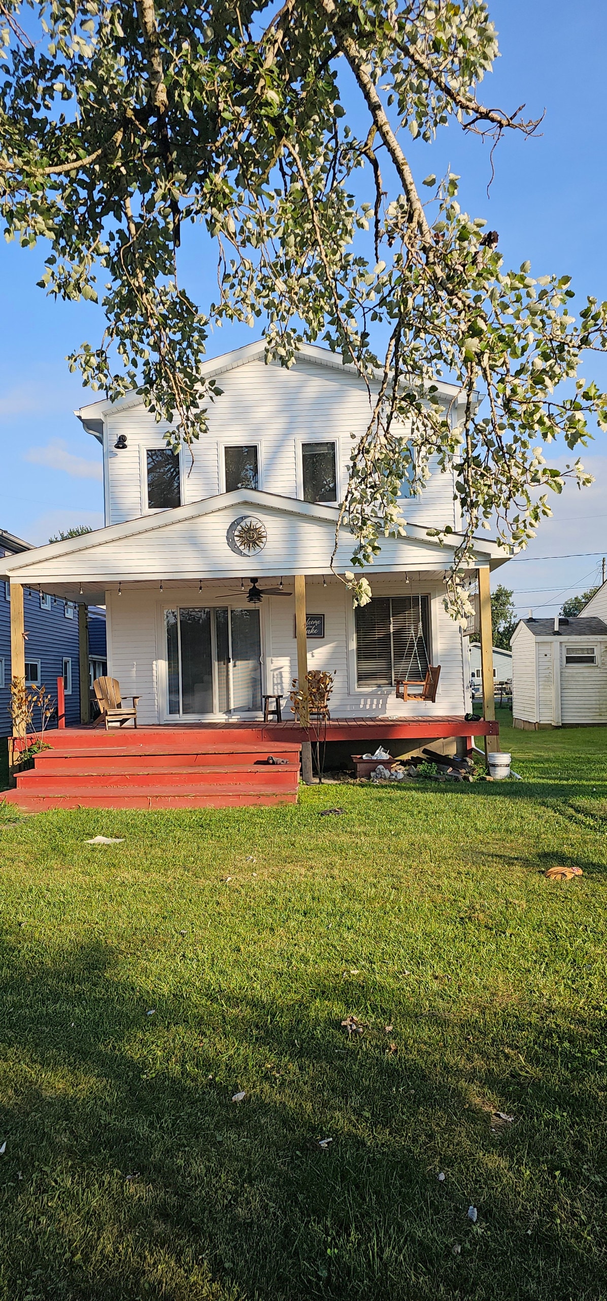 All Pets Welcome No Pets Fees No Cleaning Fees Complimentary early check in and check out when available This cozy waterfront cottage sits on Halfway Creek on the Morin Point private drive peninsula which connects to Lake Erie. Water views from the front and back porch New renovations featuring a King Bed Suite with a view of the water. New living room sectional with a view of the creek Full Nautical Theme New Bonus area on the front porch Smoking allowed in the front porch shed