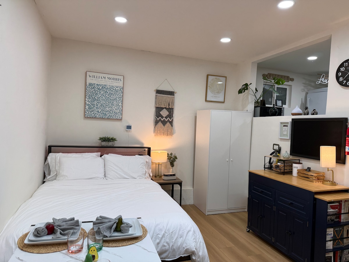 This stylish studio is located in a family-friendly neighborhood and is centrally located to Ontario airport & Convention Center, numerous hospitals & shopping malls, and about an hour away from the mountains, beach, and LA. This studio is equipped with everything you would need! There is a small kitchenette, including a Keurig, hot plate, microwave, and mini fridge. There is a small patio area to enjoy the outdoors, or TV to watch your favorite shows. You are sure to have a relaxing stay here!
