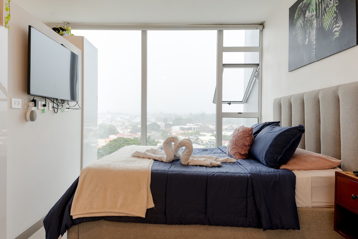 Piso 18 con vista panorámica y brisa fresca Este loft moderno combina estilo y comodidad con un balcón integrado y cortinas blackout para mayor confort. Perfecto para parejas, viajes de trabajo o estancias largas, ofrece Wi-Fi rápido, área de iworking, piscina y parqueo privado. Ubicado en una zona segura y céntrica de Curridabat, tendrás todo a tu alcance. Como Súper Anfitrión Top 10% en Costa Rica, garantizo atención rápida y dedicada para que tu estadía sea inolvidable.