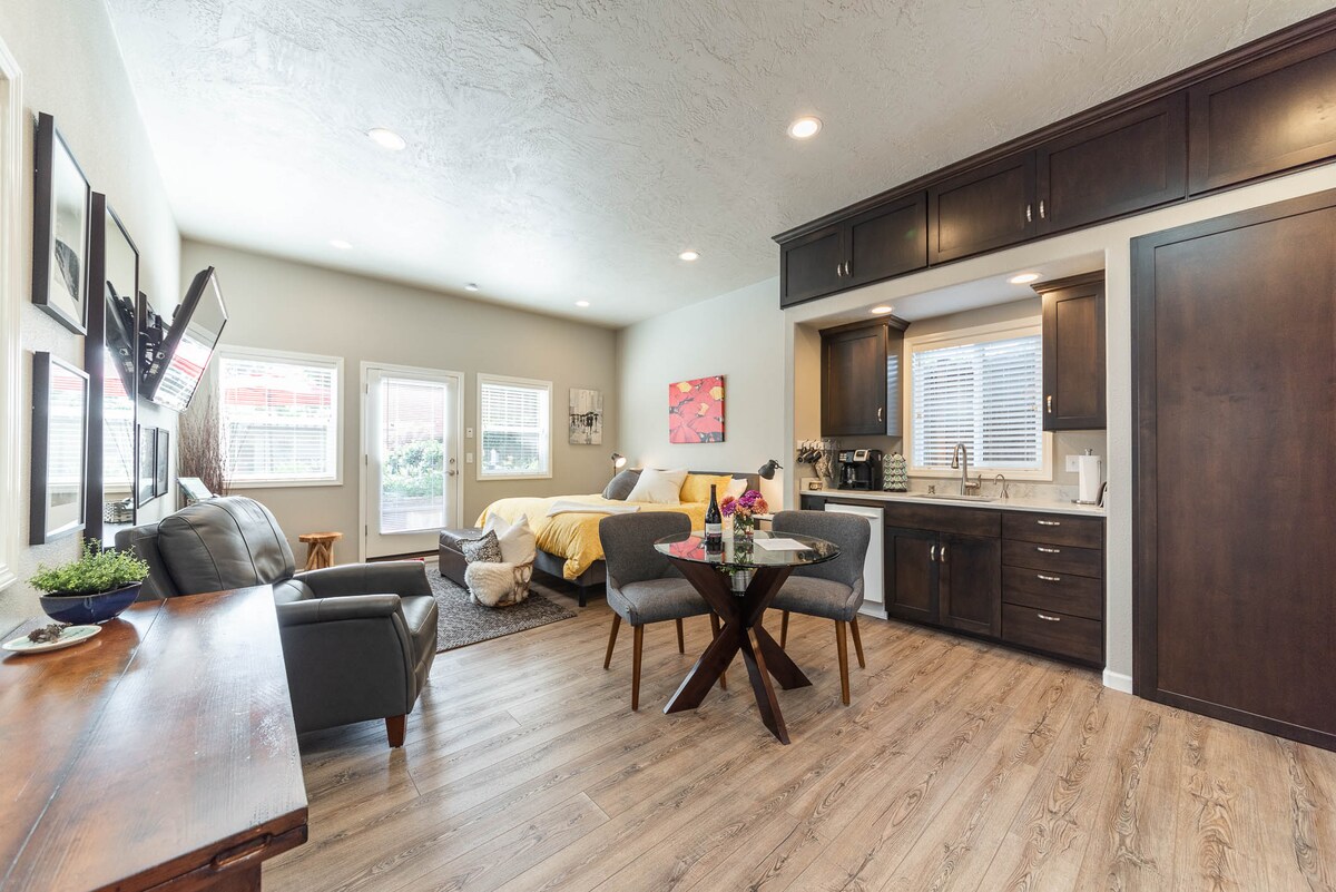 Click the heart to wishlist this gem! ❤️ Washburne Studio offers a pocket-size luxury experience. This cozy 425 sq ft attached studio includes: 🛏️ King size bed 🧖♀️Hot tub 📺 55” TV 🎬 Netflix 🔥 Fire table 🌿 Private courtyard 🧺 Washer/dryer ⚡ Fast WiFi ♿ Universal design features ☕ Nespresso 📍 You'll be within 3 miles of: 🎓 University of Oregon 🏟️ Autzen Stadium 🏀 Matthew Knight Arena 🍻 Downtown Springfield (walk to Public House!) Feel free to message me with any questions! 😊
