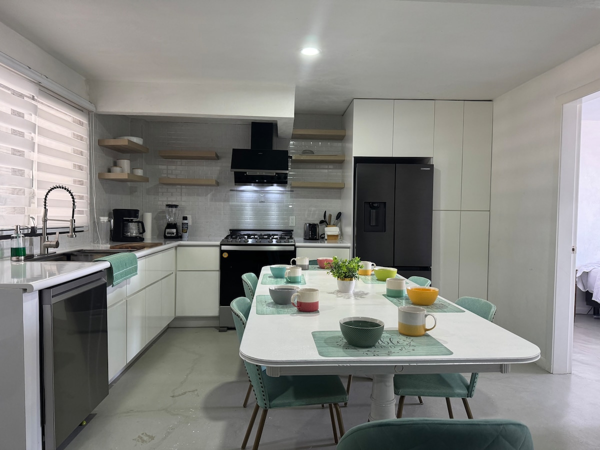 Relax in a cozy cottage, with a full kitchen and breakfast bar, bathroom with shower, large bedroom and small balcony with beautiful views, Wi-Fi and work area, garden and private parking. Excellent location, 10 minutes from downtown Texcoco, a few minutes from a shopping mall, 2 minutes from the historic Molino de Flores hacienda and 15 minutes from CIMMYT.