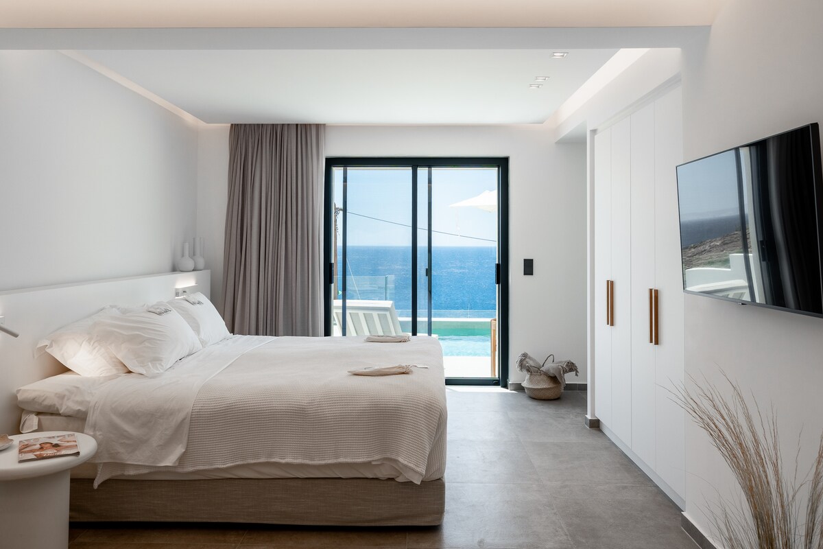 A newbuilt luxury and sophisticated Villa that can accommodate 4 people in two bedrooms. Fully equipped with everything someone might need to feel at home. Located at the entrance of the picturesque village of Batsi with breathtaking unobstructed views of the Aegean Archipelago. All spaces are comfortable simple and practical, made to provide seamless relaxation. Exclusive use of the pool and outside area that has been designed with beautiful outdoor furniture.