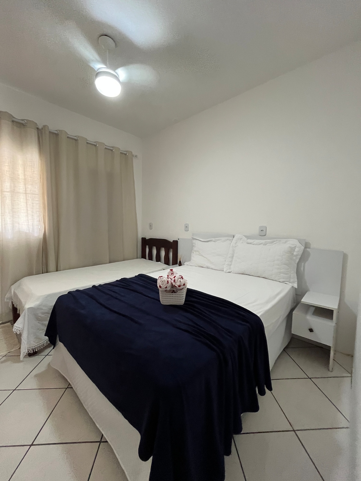 Casa com 2 quartos, sendo 1 suíte, 2 banheiros, apenas 1 chuveiro elétrico, chuveiro no quintal, cozinha equipada e ventilada, vagas para 4 carros, 2 camas casal e um colchão casal extra, 3 ventiladores, não temos ar condicionado, menos de 2 minutos caminhando para praia.