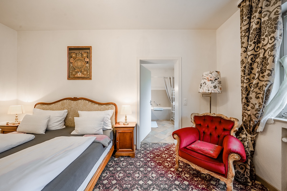 Charming apartment with access to idyllic garden with stream. Quietly located but sufficiently central in the Markgräflerland at the foot of the Black Forest. 2 minutes to nature, the bus stop or a shopping facility; 5 minutes to Müllheim. The border triangle offers a wide range of activities related to nature (Black Forest, vineyards, Rhine plain, ...), culture (wine, theater, museums,...), cuisine and sights of all three countries.