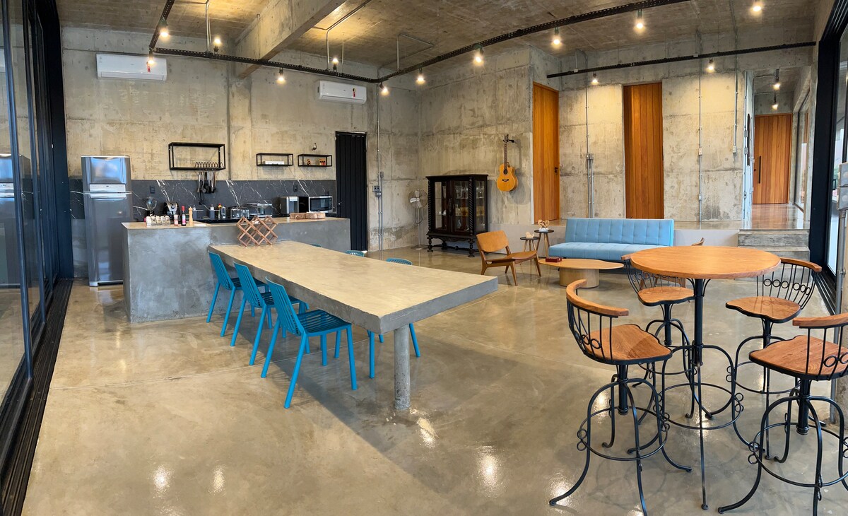 You and your family will stay in a unique farmhouse, within a rural residential condominium, just 10 minutes from the city center! I invite you to experience life in a beautiful modernist house, with a spectacular view of the lake and sunset, created in reinforced concrete, with a gourmet area, swimming pool, hammock area, swings, sand court and a tennis court on natural grass! Your stay promises unforgettable moments and fascinating discoveries!