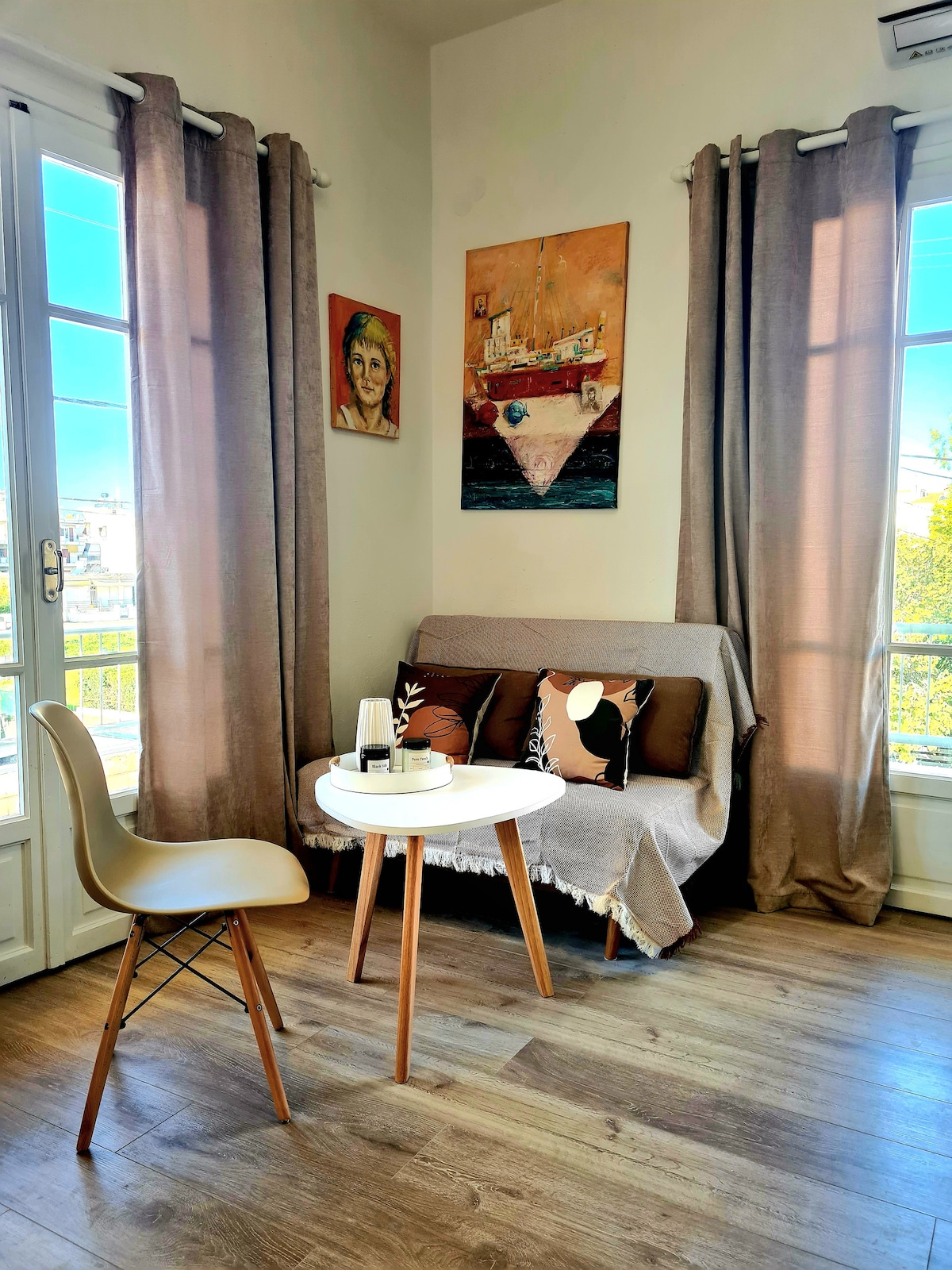 Sunny, and comfortable apartment with a splendid balcony with unique views of Bourtzi and Palamidi. Our place is located just outside the historical part of Nafplio. Shopping, restaurants, and bars are easily accesible on foot but we also provide free parking. The apartment is fully air-conditioned and with strong Wi-Fi in all rooms and can host up to seven guests in comfort and style.