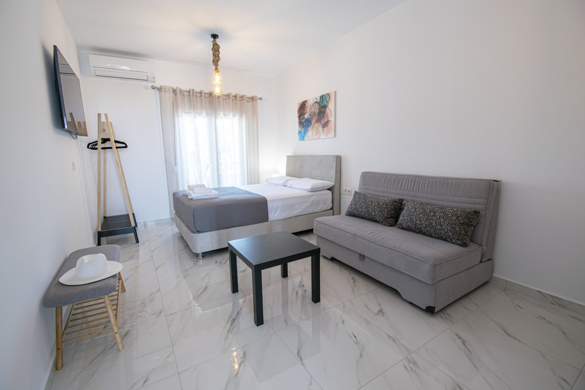 A double bed studio, nice, cozy, and comfortable. Max. guests: 2 people (Max.Adults:2 It has 2 single beds or one comfortable double bed, a fully equipped kitchenette, a private bathroom WC/shower, balcony with a sea view. A/C Hot water 24h Free Wi-Fi Changing linen and towels every 3 nights Daily cleaning wardrobe, balcony, direct sea view, awning, mosquito nets.