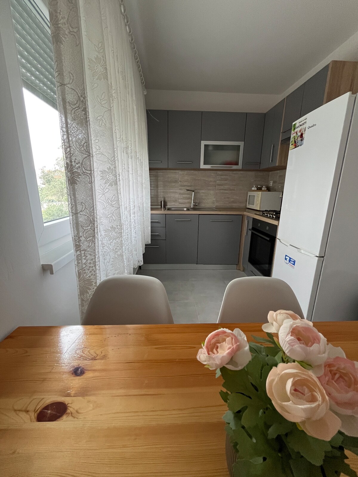 Modern, family-friendly apartment just 300m from the beach. Features a bright, white interior, 2 bedrooms (luxurious box-spring bed + twin beds), private dining area, terrace with grill, and access to a shared stone-grill tavern. Free bikes, scooters & toys for kids. Large green yard for play. Quiet location – perfect for families seeking relaxation and comfort.