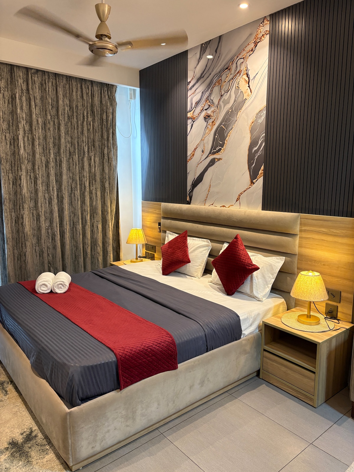 Our newly constructed 2 BHK apartment blends modern comfort with natural charm. The space features 2 serene bedroom with a queen-size beds, a spacious living room, a well equipped kitchen, 2 bathrooms: one attached to the master bedroom and another accessible from the living room and second bedroom and L- shaped balcony offering great view of the city. The property is located near a premium mall in Noida! This well-situated location offers you the convenience of shops, cafes, and entertainment.