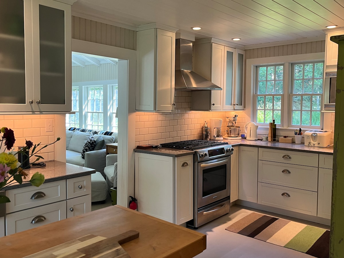 Romantic and private, this 2,000 sf modern luxury cottage nestled on twelve acres is a favorite of honeymooners and lovers of modern design * 1 hour to Acadia National Park & Bar Harbor; 15 min to shopping, hiking, swimming * Stargazing deck * 2 full baths, one with steam shower * Fully equipped kitchen with under-counter fridge/freezer * Two gas fireplaces, one indoors, one on a covered deck * Queen bed with luxurious linens and pillows * WIFI, streaming TV, grill, bar * EV charger
