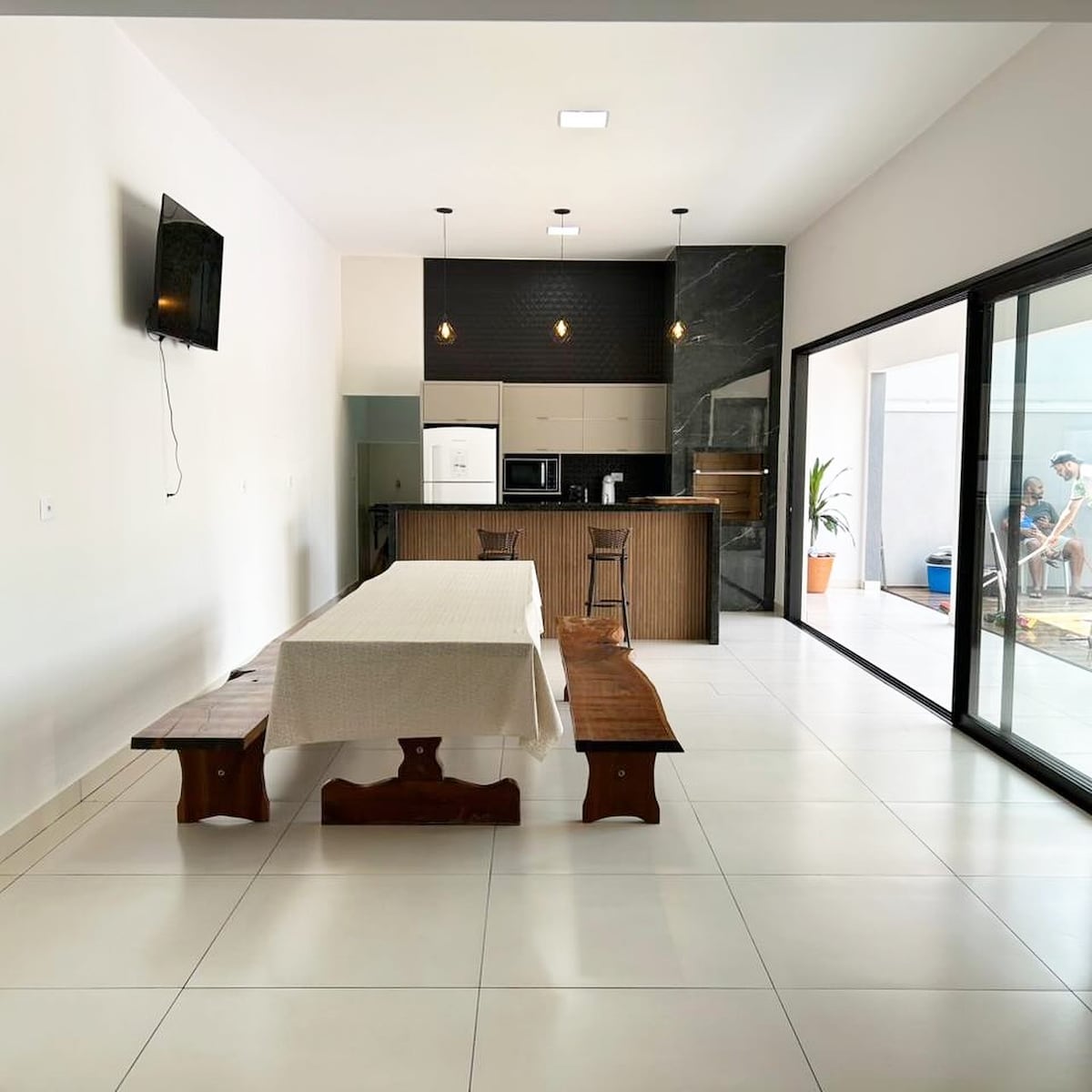Large leisure area,barbecue, cabinets , grills, skewers and etc. Kitchen,laundry. It has 02 suites with air CONDITIONING. each with 02 bunk beds(single bed) and auxiliary mattress. Free space in the garden with table and umbrella, uncovered parking for 04 cars. The differential of our house is the Gourmet area all closed with railings , if the weather( rain) does not work you will have space to enjoy. There are fans in the lounge. Animal pets check the possibility
