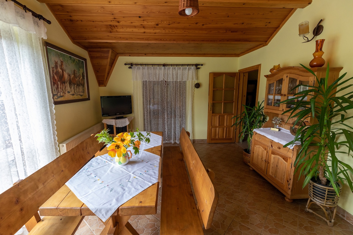 Year-round creekside house in the picturesque village of Uhryń (next to the age-old barn). Guaranteed peace, quiet, and unspoiled by nature. Two bedrooms, dining room with kitchen, bathroom with shower, sink and toilet, spacious hall. Heating with electric-oil stoves or, if someone prefers, with a tiled stove (wood included in the rental price). In the dining room, a two-burner electric stove. In the bedrooms - a double bed and two single beds, in the dining room - a sofa bed for two people.