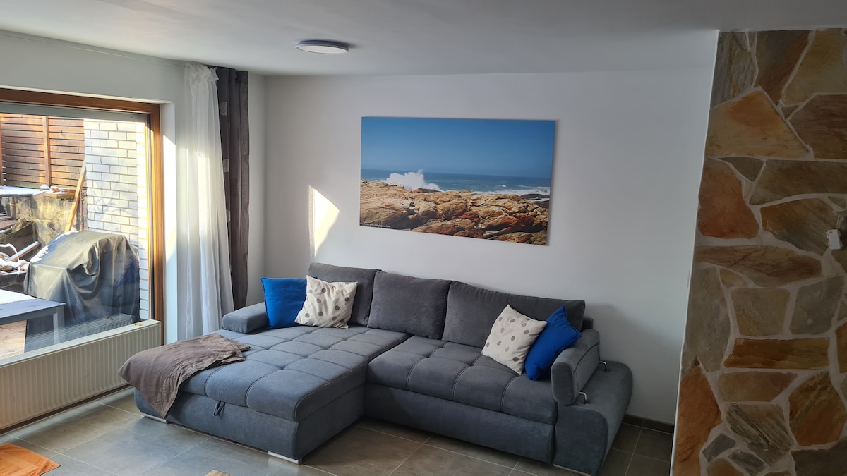 2-Zimmer Souterrain-Wohnung/1 bedroom basement apartment. Note: Limited daylight on cloudy days. Please only book if this is ok for you. Please note: Limited daylight on cloudy days. Book only if this is okay for you. Modern furnished 2-room apartment (45 sqm) for up to 3 people. With kitchenette, 55 inch TV, a double bed, sofa bed, sofa, wardrobe, dining table, bathroom with rain shower (new sauna for a fee of 15€ flat rate)