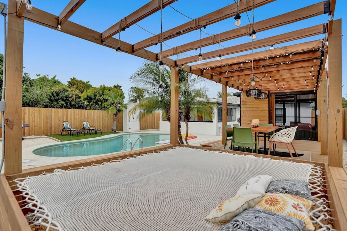 This recently renovated home has been carefully designed with the vacationer in mind. Located just north of downtown, this home features a huge resort style backyard to enjoy. The backyard includes a private pool, huge outdoor deck and dining area, tanning net, a gazebo with an outdoor TV, and even an outdoor refrigerator to store your drinks. This home is located just 15 minutes from Las Olas, the beach, and Wilton Drive. Ready to relax in the backyard oasis? Book with us today!