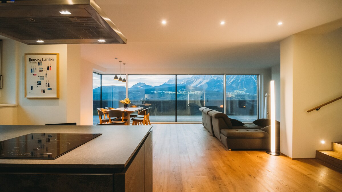 Welcome to the GIPFEL-GLÜCK penthouse. The pinnacle of the Sunleitn Residence: 107 m² with an open-plan living/dining area and an impressive exposed roof truss. Fully equipped kitchen and access to a spacious terrace with a 180° mountain panorama in complete privacy. Unwind in the private Finnish reclaimed-wood sauna with a view of the mountains. 2 bedrooms, ideal for up to 4 guests.