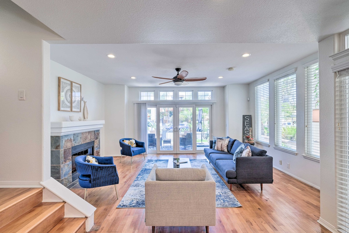 Relax and recharge in this spacious 2nd floor villa with stunning ocean views and a full-body massage chair in the master suite with a private patio. Just steps from Marine Beach. Enjoy high ceilings, a cozy fireplace, a fully equipped kitchen and lots of natural light. You'll also have Wi-Fi, cable TV, a laundry room/home office, parking for one vehicle, and beach chairs, towels, and more. Weekend getaway or a longer escape, this villa is your perfect La Jolla sanctuary.