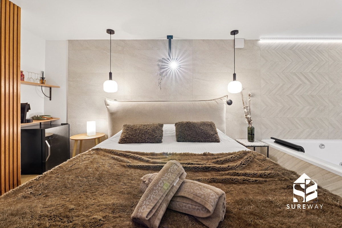 Beautiful romantic suite with chic and refined taste near Paris, 20 minutes from Roissy CDG and Chantilly. 15 minutes from Parc Astérix and Mer de Sable. Suite ideally located in the heart of a village with a beautiful swimming pool in the heart of the forest during the period July/August (5-minute walk). The village has a bakery, grocery store, restaurant Fast food deliveries possible and a 5-minute walk to a pizza vendor. (artisanal pizzas)