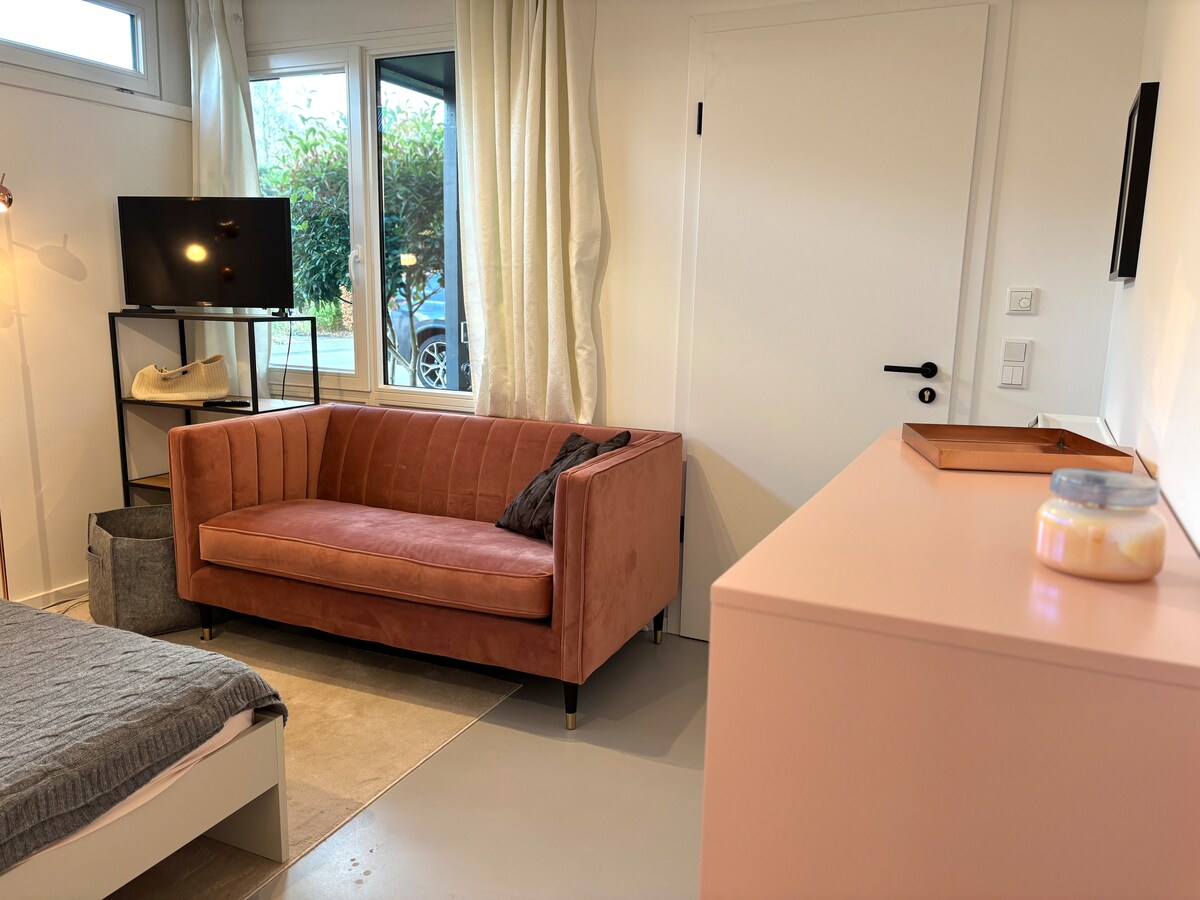 The detached house with garden is close to the university and the city center of Oldenburg. Through the very large windows you can look into the idyllic garden, where a beautiful terrace invites you to linger. The very spacious living room leads into the dining room and is predominantly furnished with restored teak furniture. In the annex there is a large room with a living and sleeping area and a third bathroom. The entire ground-level house is fully available for the guests.