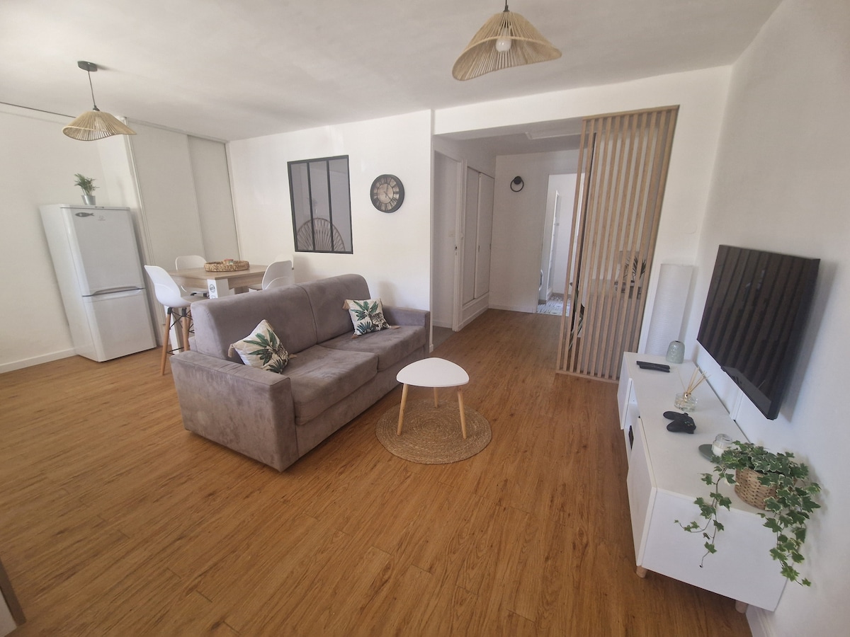 SANARY - Superb Apartment 70m2 (T 2), renovated, small residence 5mn walk from the center, shops and restaurants. Large closed garage. Tesla electric vehicle outlet offered. AIR CONDITIONING June 2025. 3rd and top floor , facing the sea, stunning views of Sanary harbor. Quality services Bedroom double bed 160. Large living room, dining room, living room, adult sofa bed (2x90 cm). Sea views for all rooms. Large balcony outside furniture. Spacious bathroom. Separate toilet.
