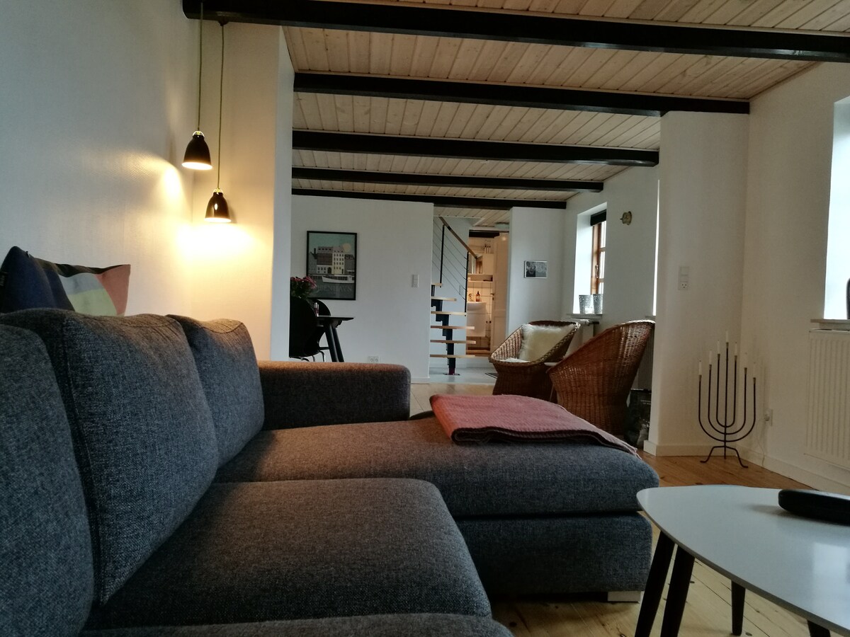Apartment on charming old farm from 1866. Located on the 1st floor, next to another apartment. Includes large living room with kitchen, dining area and sofa group. 2 bedrooms and toilet with bath. The area is for nature lovers, in the middle of the raw Bornholm nature, with quarry lake. When you open the window, you are greeted by a chorus of birdsong. There is a shared entrance, garden area, barbecue, etc., with another apartment