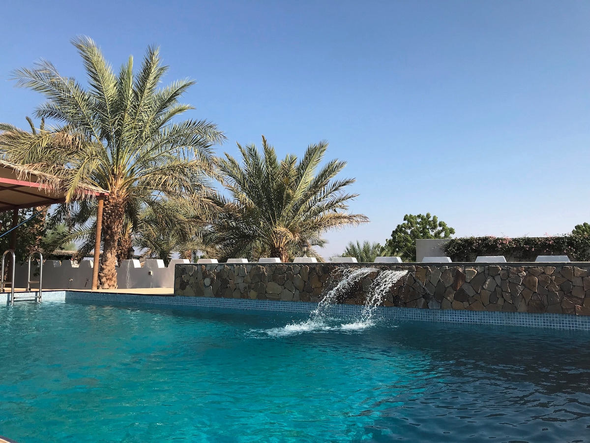 Escape to a deluxe self-catering eco-cabin at the heart of our Oasis plantation. This unique adult-only getaway in the heart of Oman is surrounded by date palms, fruit trees and flowers, all for you to explore and enjoy. Wake to the sound of birdsong, chill by the pool, under a tree, end a day out with a game of boules or stroll around our 15 acres, lie back under starlit skies. Central for visits to Sinaw, Ibra, Wahiba Sands, Nizwa or Adam. Instant book, enquire or add to your Wish List.
