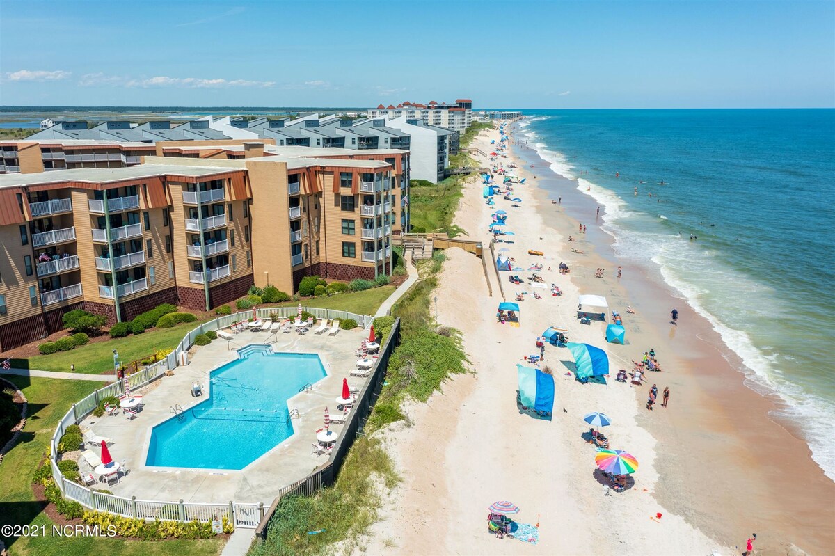 Sail Away Cove is a modern 1st floor oceanfront condo located in building 1 of Topsail Dunes. The AMAZING direct oceanfront views just don’t get any better than this! Relax by the pool or enjoy the beautiful beach just steps from the front door. This newly renovated condo has lots of exciting touches including a remodeled bathroom and a Bluetooth shower speaker. Tasteful coastal decor will keep you on "island time" while you are here. You won't be disappointed. It's a good day to Sail Away!