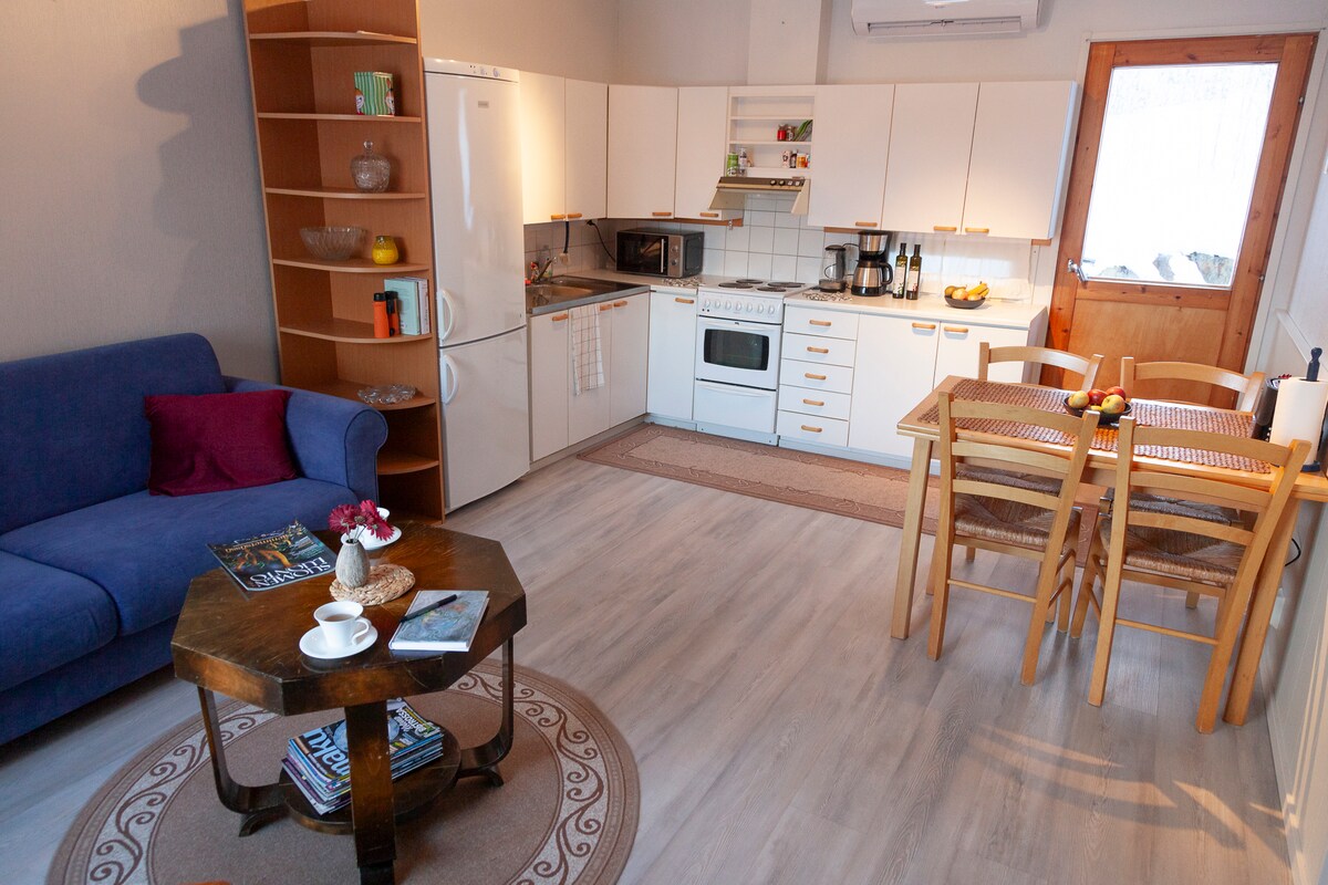 Apartment at the sheltered end of the former village school. The apartment has a kitchen, an open bedroom and a bathroom. Sleeps four. Double bed in the bedroom and a sofa bed in the living room. The apartment has a teacher's platform and outdoor stairs, so it is not accessible. The outdoor sauna is heated for an additional fee. The apartment is located in a quiet area, 8 km from the city center. The rest of the building is for the host's own use. There is room in the yard to stay and, for example, barbecue. Also suitable for families with children.