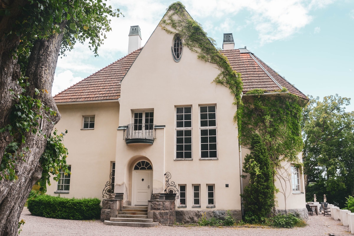 An aerial view showcases the villa's peaceful surroundings within the Stockholm Archipelago. Lush greenery surrounds the property, with a glimpse of the sea visible in the distance. Nearby houses are nestled among trees, emphasizing the tranquil and natural setting.