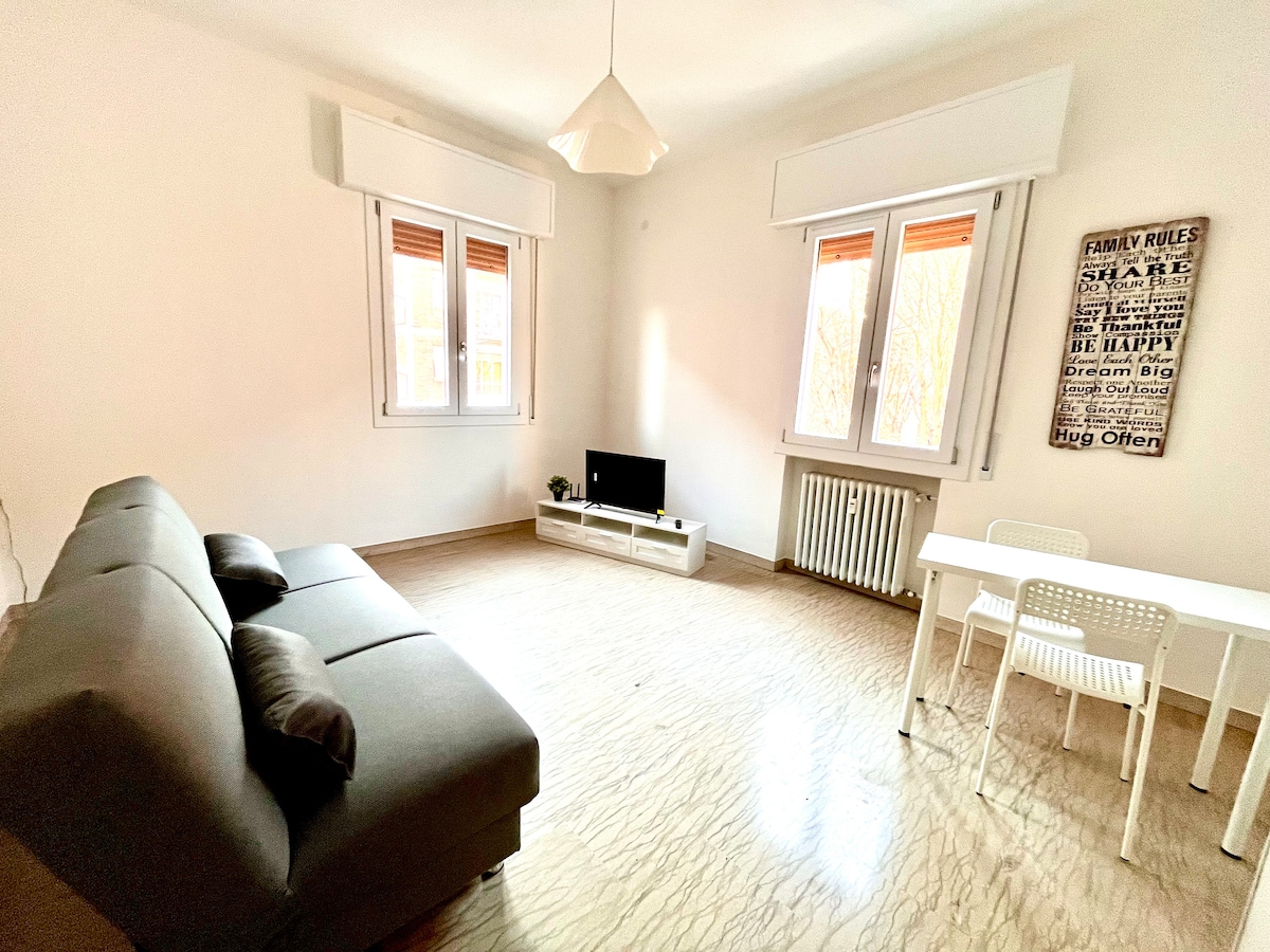 Spacious apartment in Imola, 500m from the racetrack and just steps from the historic center, recently renovated, ideal for families or groups. Two bedrooms (one double, one with two singles) plus a sofa bed. Reserved parking, large terrace, free Wi-Fi, equipped kitchen, and air conditioning. Quiet area, well connected: 30 min from Bologna, 25 from Faenza, 40 from Ravenna.
