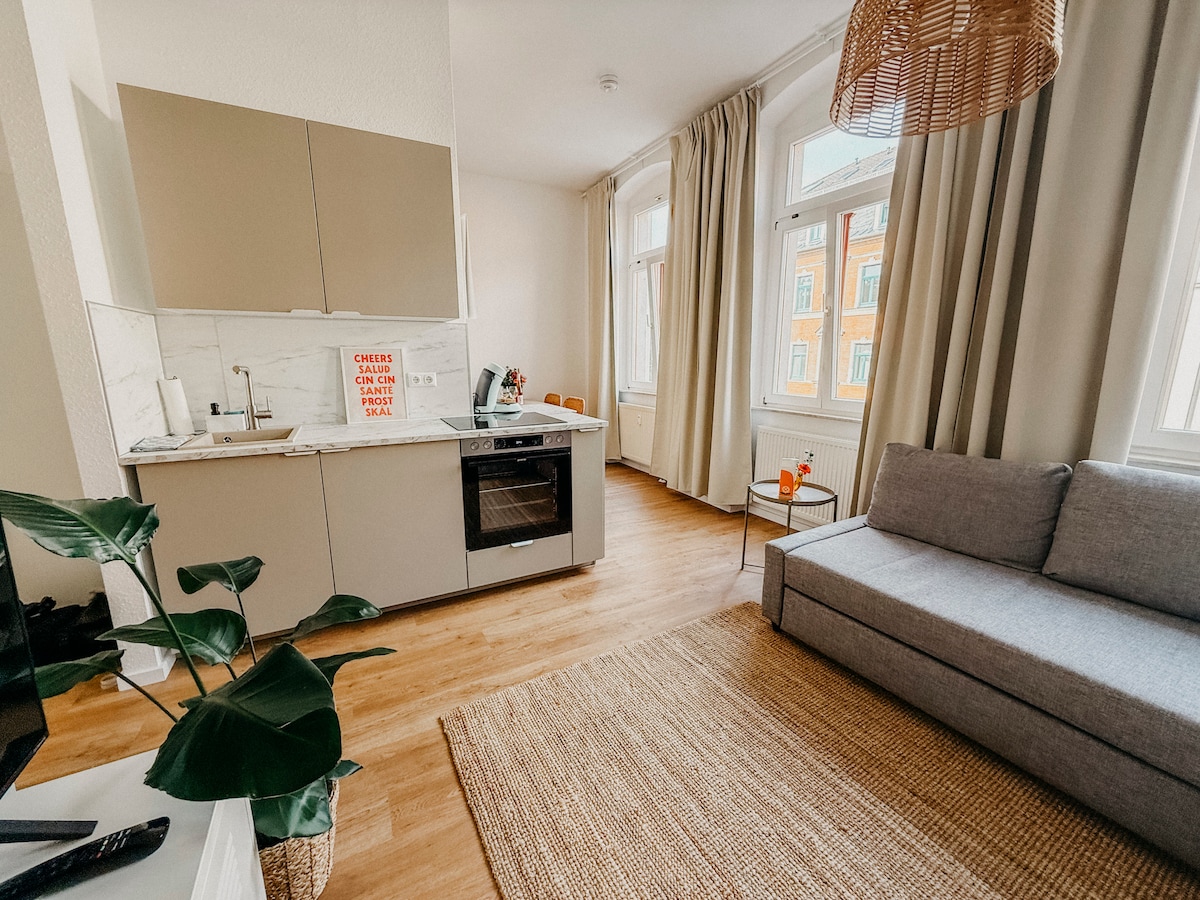 You will be staying in a two-room apartment with one bedroom, a living room, and a new kitchen with a dishwasher. You will sleep in a wonderfully large bed (160 cm x 200 cm) or on a comfortable box spring couch (160 cm x 200 cm permanent sleeper). You can end the day with a glass of wine on your balcony. A private parking space in the backyard is included with the apartment. Trachenberger Platz is the center of the Pieschen district with a supermarket, kebab shop, bakery, butcher, etc.
