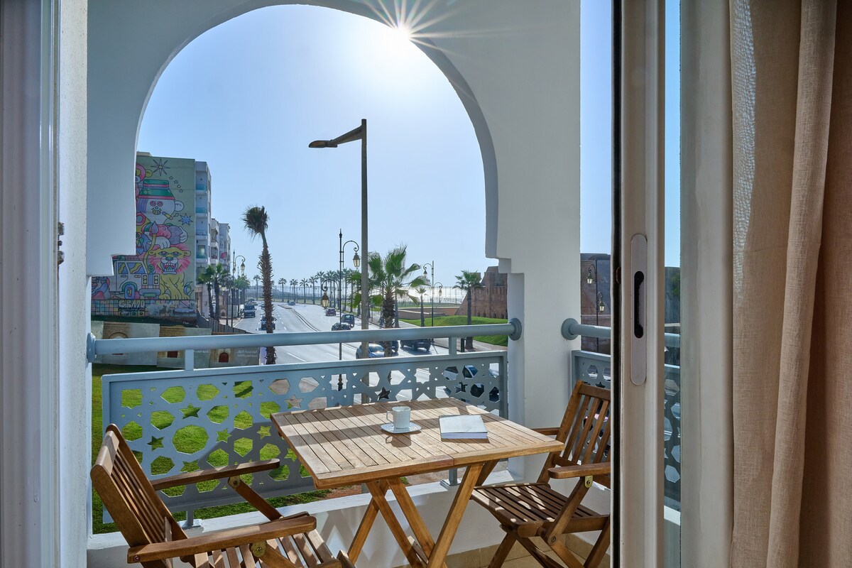 Beautiful two bedrooms apartment fully renovated with Moroccan and modern touch It offers a breathtaking sea view from balcony and all bedrooms . The residence is located along the Rabat corniche, offering easy access to restaurants and beachfront shops within walking distance, And just minutes drive from rabat Agdal train station Free private parking high-speed connection. Fully equipped kitchen Air conditioner in the living room