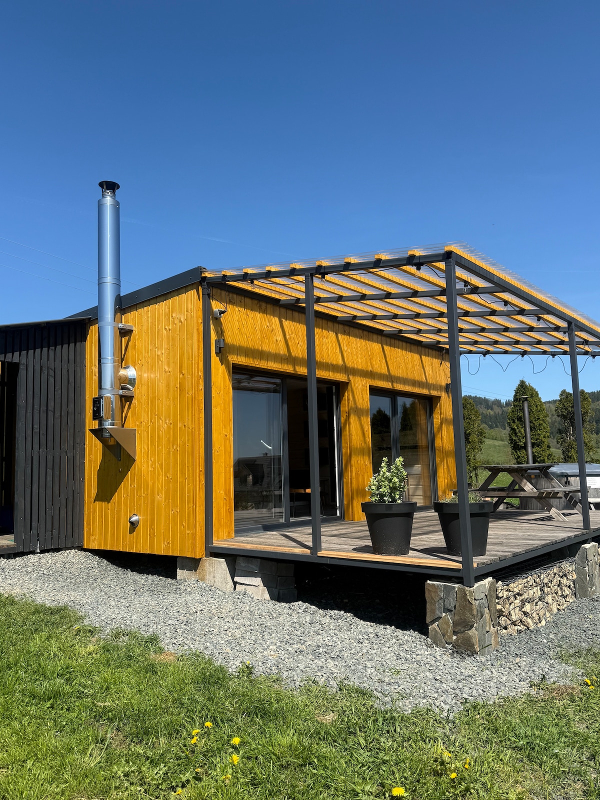 Chatka Borowka is a true tiny houses trend. It is full of sun, wood and has a view worth one million dollar and abit more. View of green mountains and city lights gleaming far away. Bad weather? You can turn on a projector or enjoy a sauna Chatka Borowka is located at the very border of Giant Mountains National Park and offers unlimited possibilities of relaxing in the open air. Chatka Borowka is a place made for lonely tourists and couples. With a bit of necessary luxury like air condition.