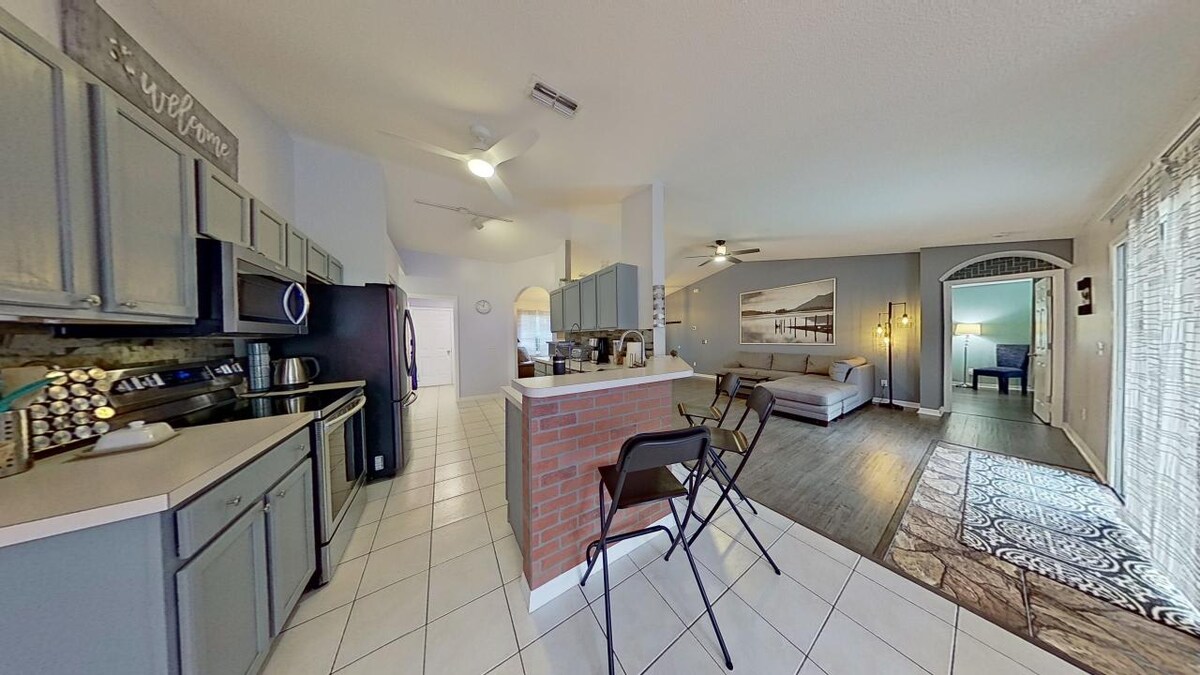 *MODERN*OPEN*HEATED SALTWATER POOL*CLOSE TO BEACH*FENCED IN YARD*DOG Located in Palm Harbor area, Close to beach,shopping, and Restaurants. We welcome you to our new home in Palm Coast. EVERYTHING is new and of higher quality. We have furnished and stocked this home as it were a year round primary home. This kitchen has beautiful cabinets, granite counters, new stainless steel applinaces, tile floor thru-out, bamboo window treatments, stone showers, plenty of closet space