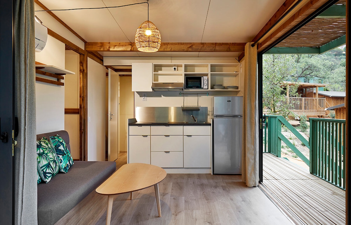 Forest Bungalow: Modern and practical Enjoy the comfort and atmosphere of L'Escala. Located in Camping Lacus, this bungalow offers a strategic location in the town center, ideal for a dynamic holiday just 750m from Riells beach, the lively promenade, and the marina. Forget the car; everything is within walking distance: supermarkets, shops, restaurants, bars, and your pets are welcome to join you. A functional and comfortable bungalow as the perfect base for your explorations.